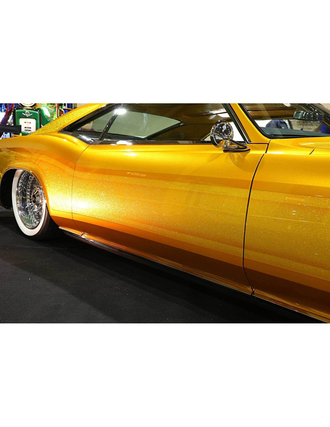 Per esempio nella foto di questo colore si nota un contro riflesso dorato che si ottiene miscelando la perla oro al candy toxic green. Il colore oro che tecnicamente è un giallo crea un effetto cangiante quando la luce solare lo illumina nei tagli del veicolo. La luce riflessa fa risalire dalle profondità del candy la tonalità della perla che in parte vien mascherata ed in parte no grazie alla natura trasparente del candy, che la maschera ma non la copre del tutto.